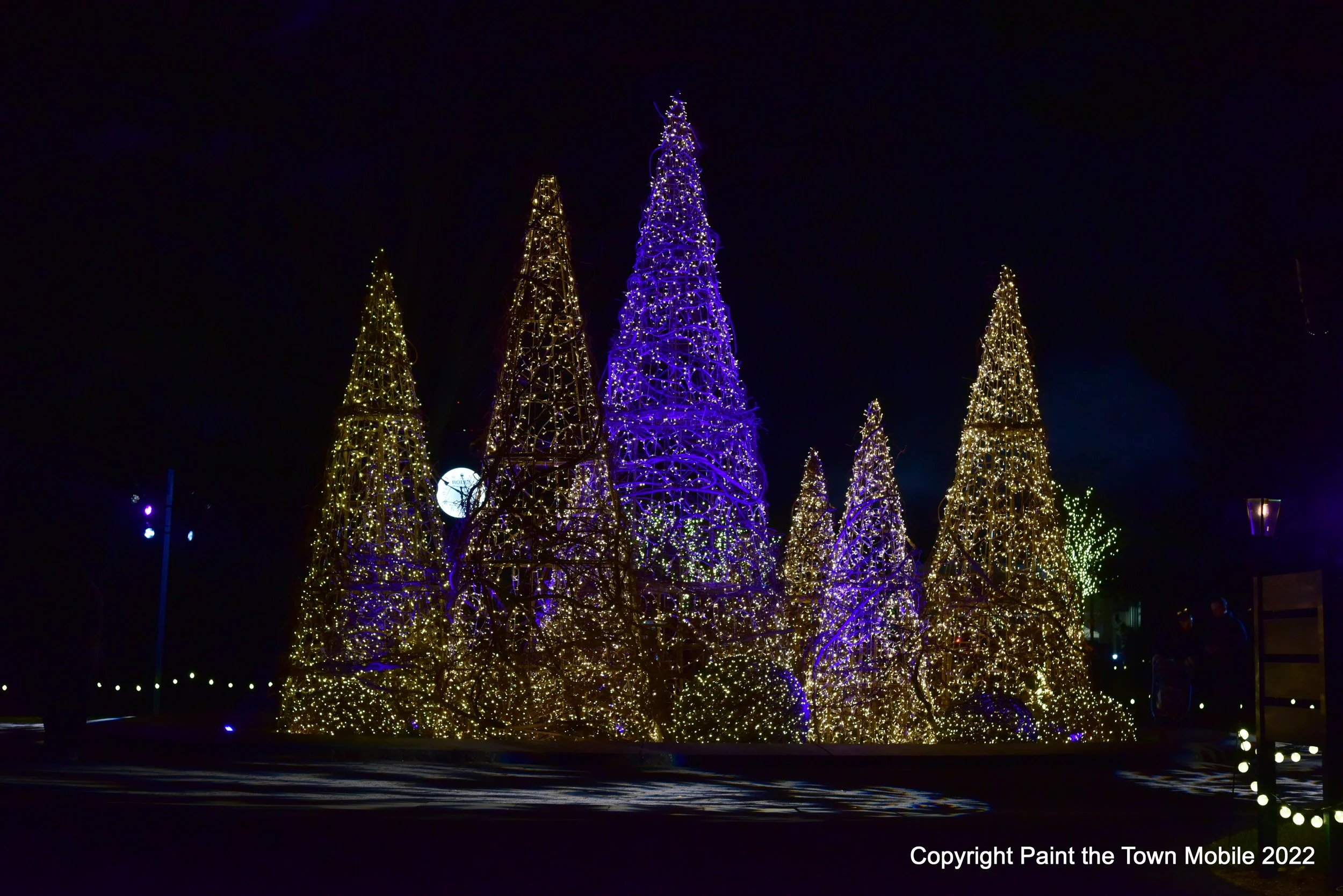 Just past the library the grass is strewn with spheres of light of varying sizes which change color every few seconds. This path leads you up to the reflecting pool, which for the holiday is dressed with trees made of vines wrapped in sparkling lights. They are a standout in the evening darkness but hard to get a clear shot here as everyone likes to use this spot for family pics or selfies. Patience is required for that split second when no one is in the frame. But it’s pretty and worth the wait.